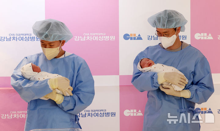 [서울=뉴시스] 조성우 기자 = 2026년 병오년 새해 첫 아기가 1일 0시께 서울 강남구 강남차여성병원에서 태어났다. 아기들이 아버지 품에 안겨 있다. 엄마 황은정(37), 아빠 윤성민(38) 씨 사이에서 태어난 여아 쨈이(태명, 왼쪽)와 엄마 황혜련(37), 아빠 정동규(36) 사이에서 태어난 여아 도리(태명)가 아빠 품에 안겨있다. 2026.01.01.