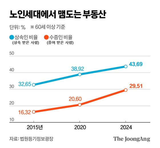상속된 부동산도 젊은 층으로 가지 못하고 노년층에서 맴돈다. '노노 상속'이다. 지난해 부동산을 상속 받은 사람(74만5000명)의 44%(32만5000명)가 60세 이상이다. 증여도 마찬가지로 증여하는 증여인, 증여 받는 수증인 모두 고령화하고 있다. 70세 이상 증여인 비율이 2020년 44.8%에서 지난해 49.3%로, 수증인은 20.6%에서 29.5%로 상승했다.함영진 우리은행 부동산리서치랩장는 “상속이나 증여를 통해 젊은 층으로 부동산이 이전되지 못해 젊은 층의 내집 마련 등 부동산 수요를 줄이는 데 기여하지 못하고 있다”고 말했다. 90대 부모의 주택이 집 있는 60대에게 상속되는 식이다.