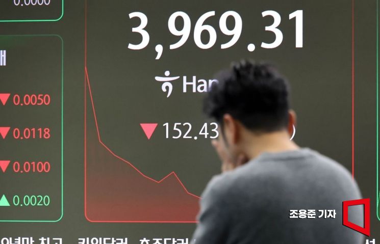 코스피가 미국 기술주 급락에 덩달아 휘청이며 장중 4% 이상 급락한 5일 서울 중구 하나은행 딜링룸 현황판에 코스피, 코스닥 등이 표시돼 있다. 이날 9시 9분 기준 코스피는 전장보다 123.87포인트(3.01%) 하락한 3,997.87시작하며 4,000선을 돌파한지 7거래일 만에 3,900선도 내줬다.